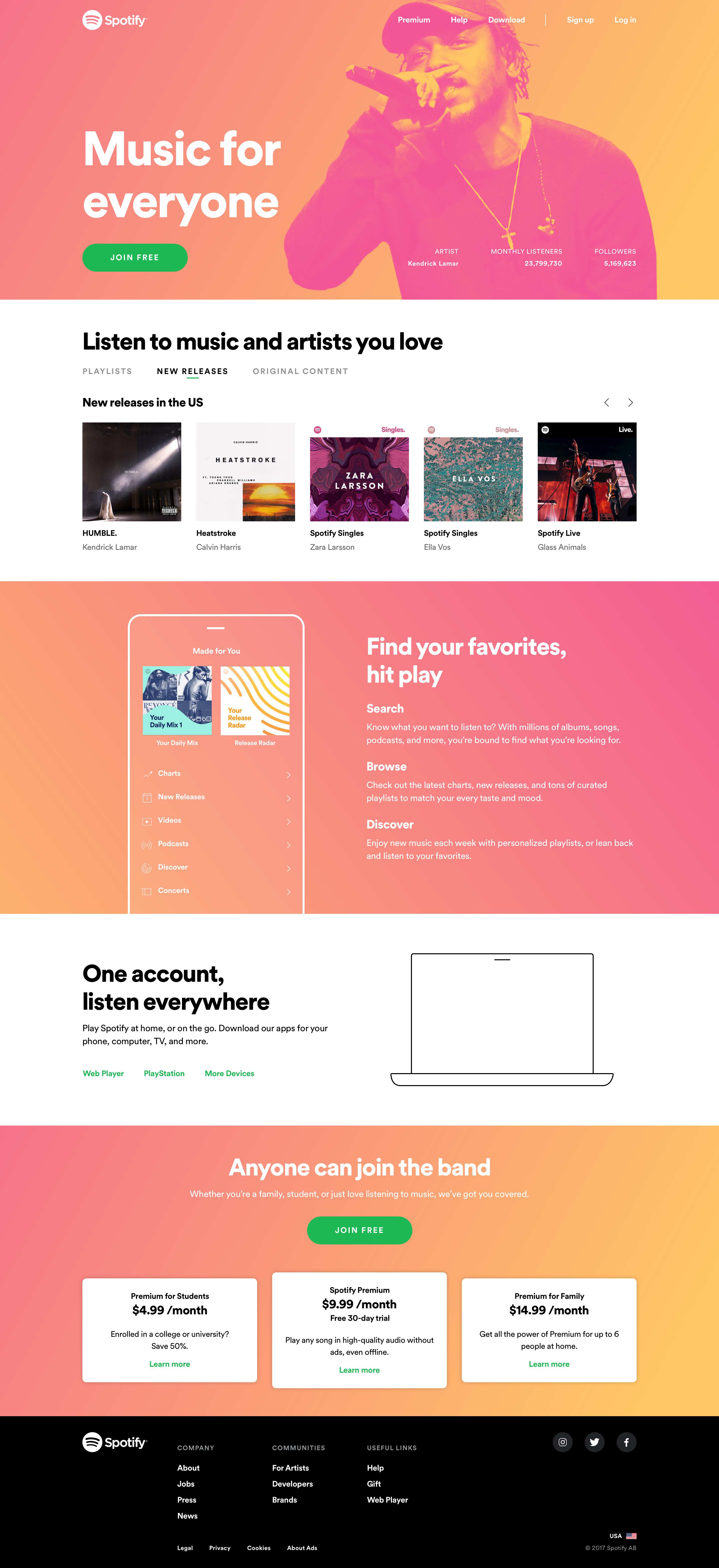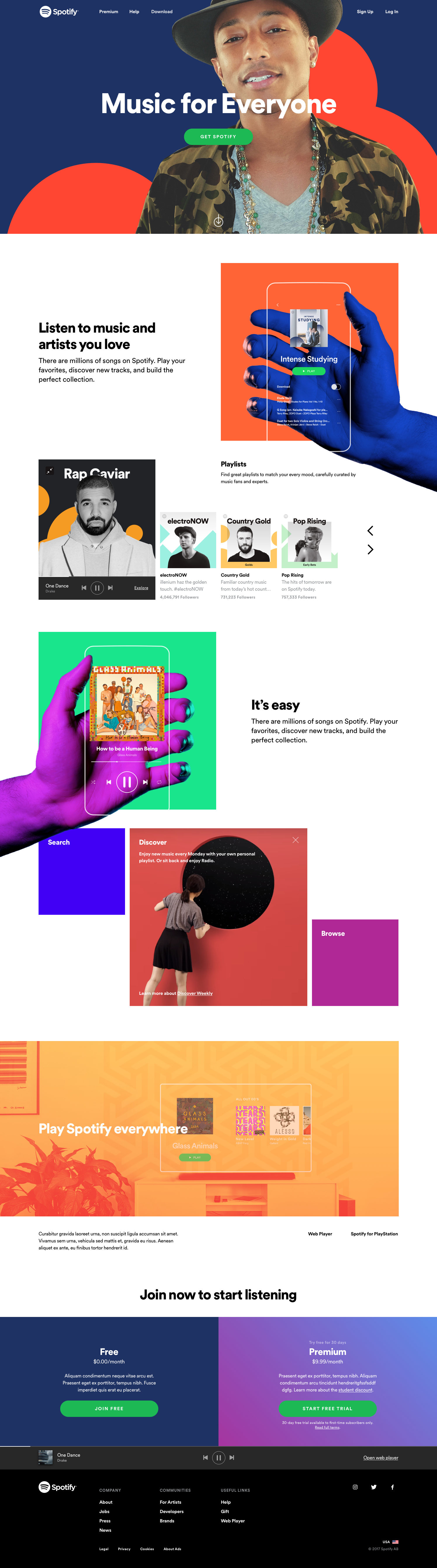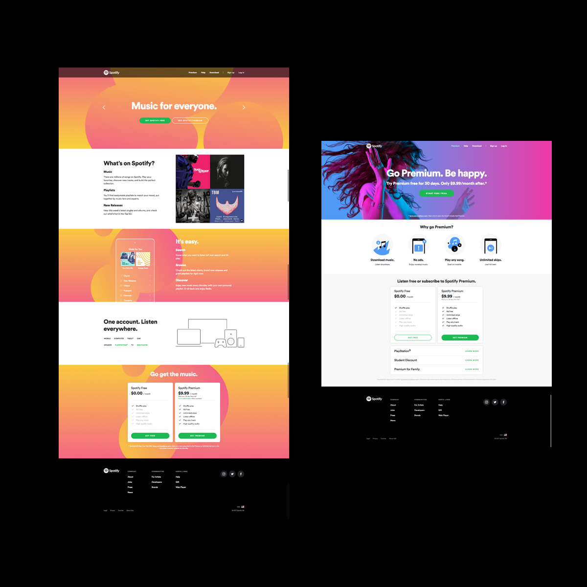 To change gears, I explored making Spotify.com a destination for more than Premium. A place to discover music, learn more about artists, and pay for the plan that makes sense for a fan.