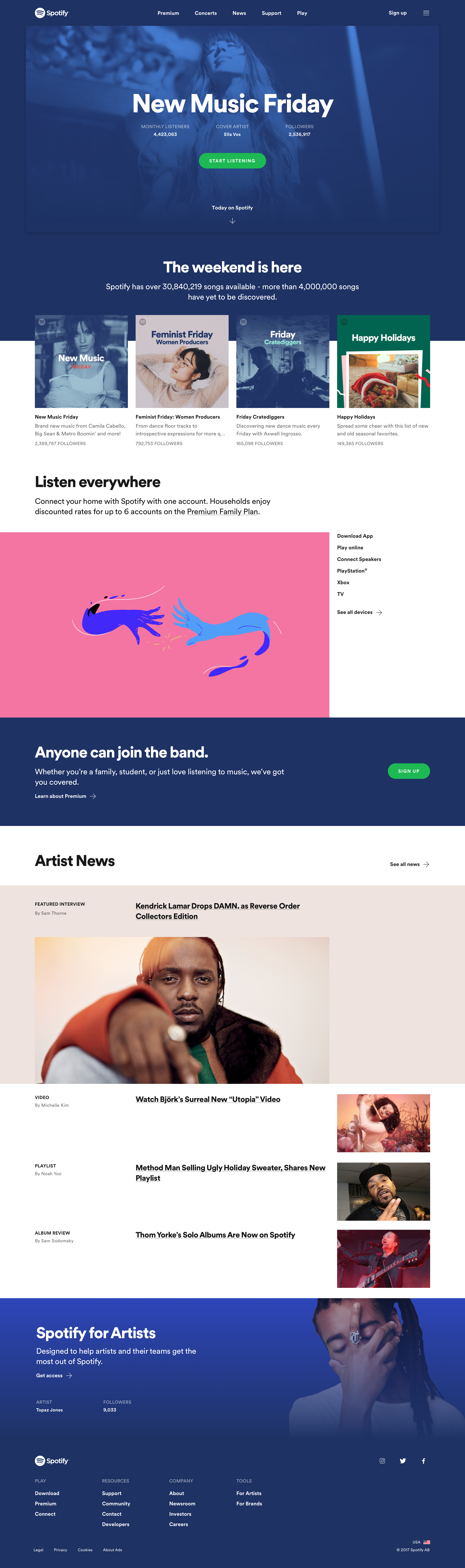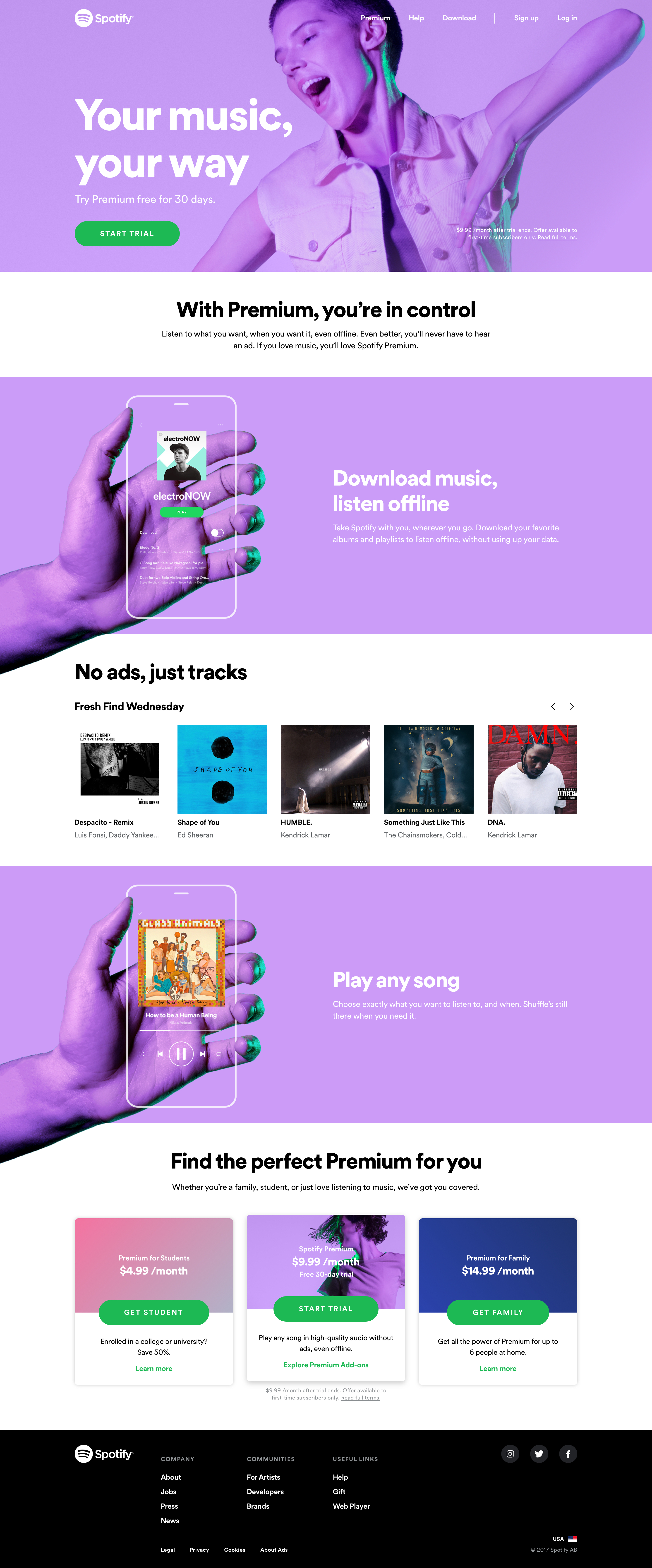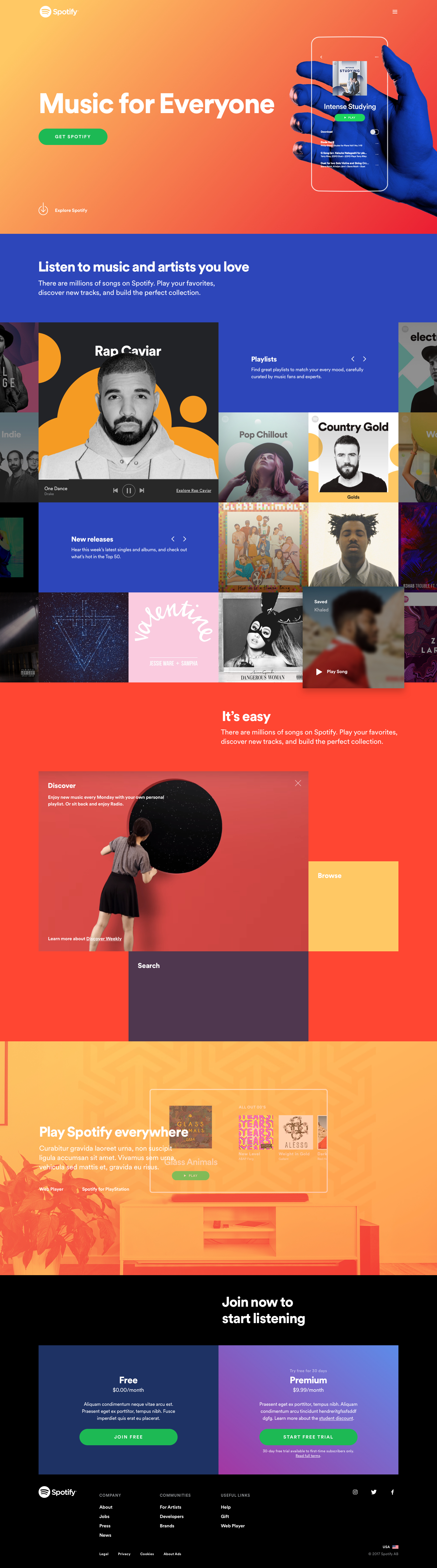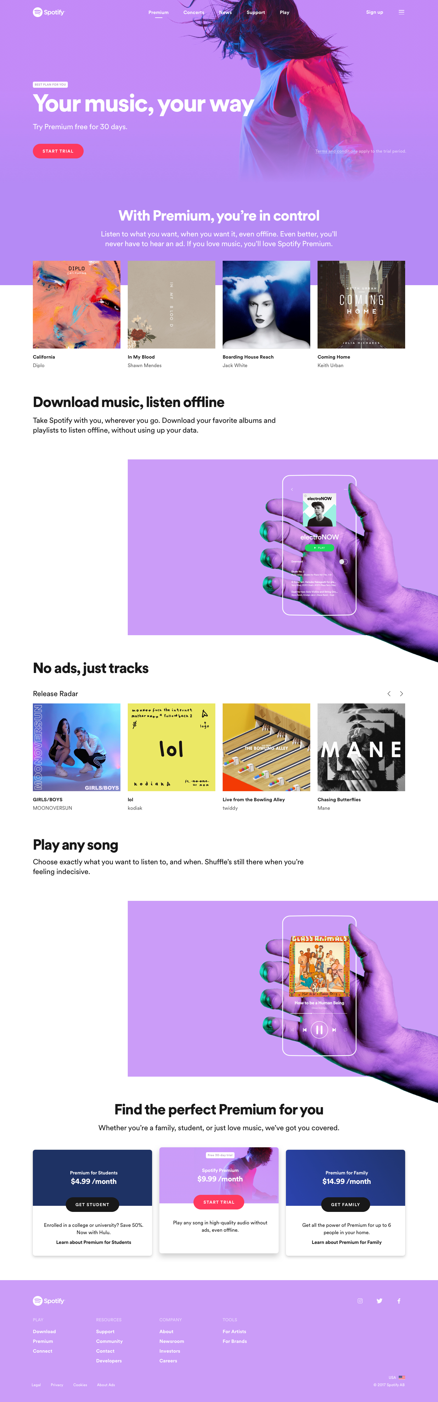 To change gears, I explored making Spotify.com a destination for more than Premium. A place to discover music, learn more about artists, and pay for the plan that makes sense for a fan.
