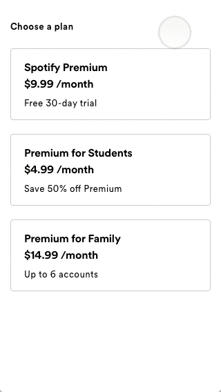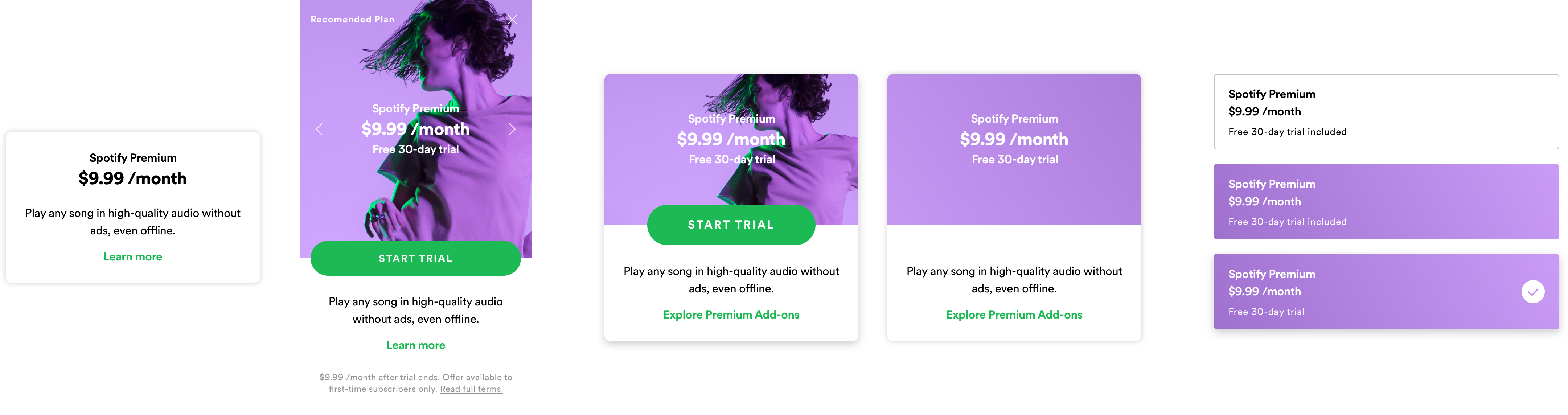 Creating adaptive components, like cards, were a way to merchandise Spotify Premium offerings. Additionally, these could become a brandable element for users to connect with through their payment experience and into the Consumer product.